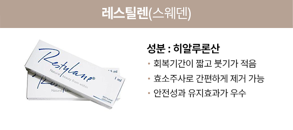안정된 필러로 시술 후의 이동이 적고 리도카인 성분이 함유되어 시술 후의 붓기와